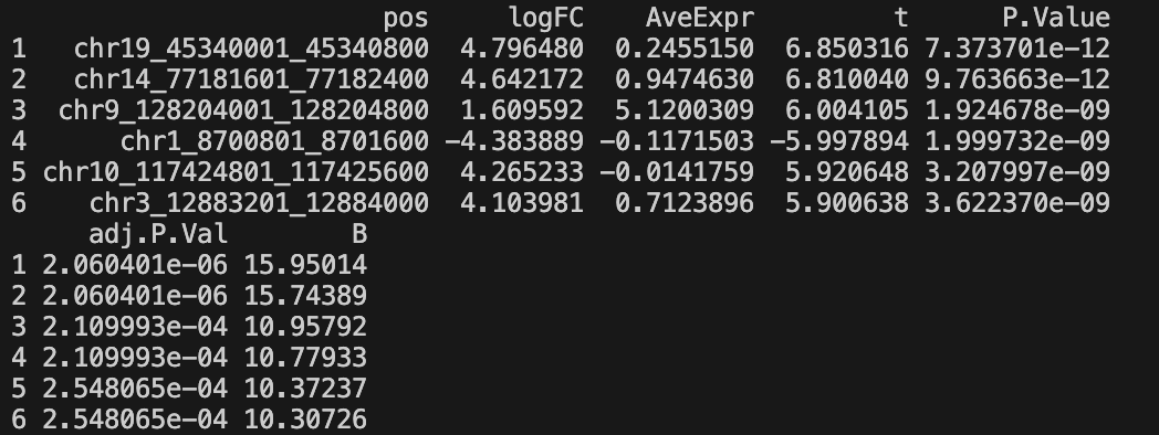 • Columns: pos, logFC, AveExpr, t, P.Value, adj.P.Val, B
