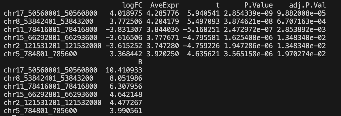 • Filtered results containing only significant regions (FDR < threshold & |logFC| > threshold)