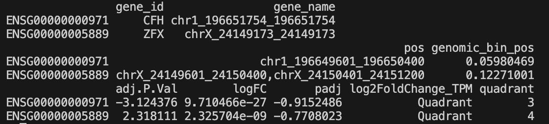• Columns: gene_id, gene_name, pos, genomic_bin_pos, adj.P.Val, logFC, padj, log2FoldChange_TPM, quadrant