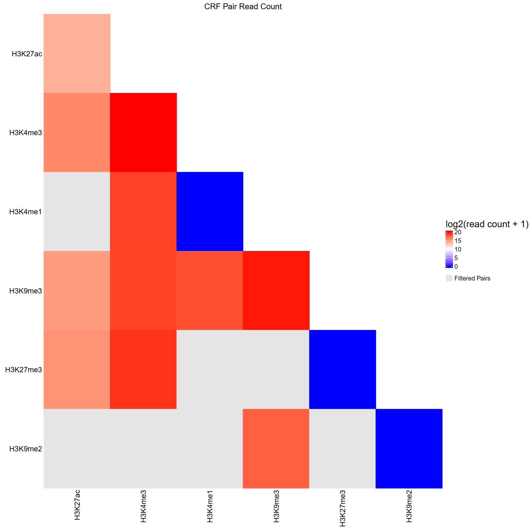 The function generates a lower-triangle heatmap displaying log2-transformed read counts for all CRF pairs. Pairs that pass the quality control threshold are shown with a blue-white-red color gradient, while filtered pairs are displayed in grey to clearly distinguish them from high-quality data. Optional CRF grouping allows users to organize and annotate CRFs by biological categories (e.g., histone modifications, transcription factors), which are displayed as colored blocks along the heatmap margins. All QC results, including read count tables and visualizations, are automatically saved to the specified output directory.