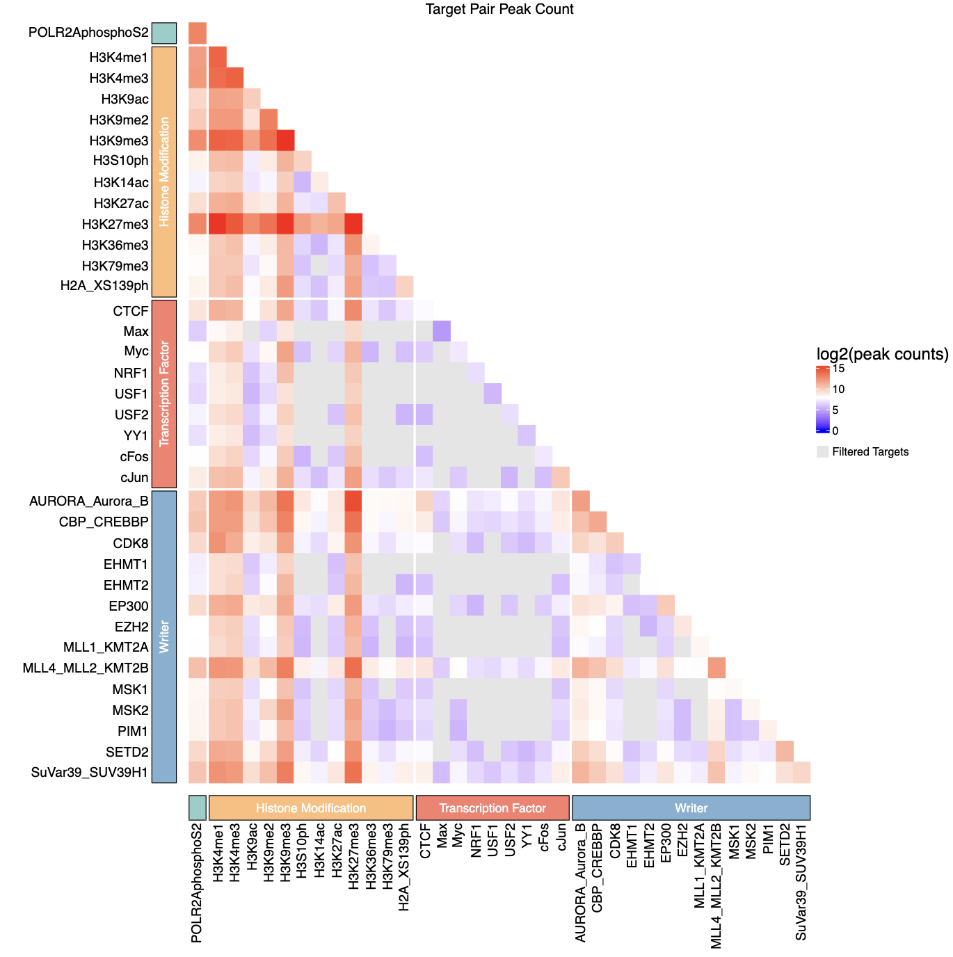 Peak counts are log2-transformed (log2(count + 1)) for visualization.